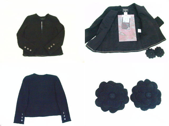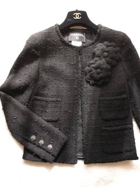 シャネル 09年 ココマーク入りカメリア2個付 ツイードジャケット ブラック サイズ38 値下げ!
